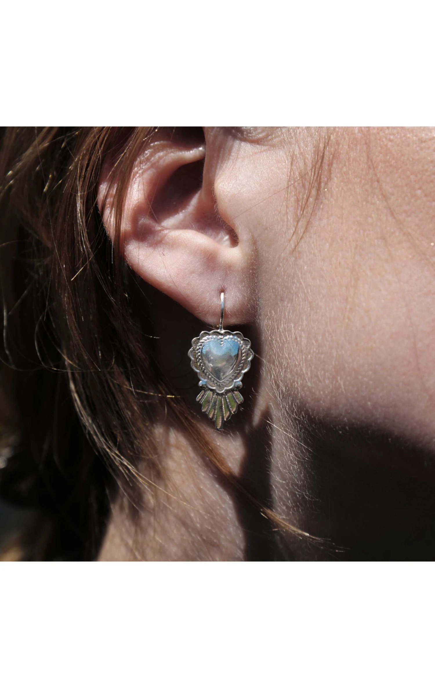 Boucles d’oreilles en laiton plaqué argent pour oreilles percées avec une attache dormeuse. Un cœur argenté est au centre de cet élégant modèle travaillé de godrons, dans un esprit ex-voto parfait pour déclarer sa flamme. On adore cette inspiration Navajo, Nouveau-Mexique à porter en total-look baroque et bariolé ou pour twister un look plus sage. Ce bijou est fait à la main.