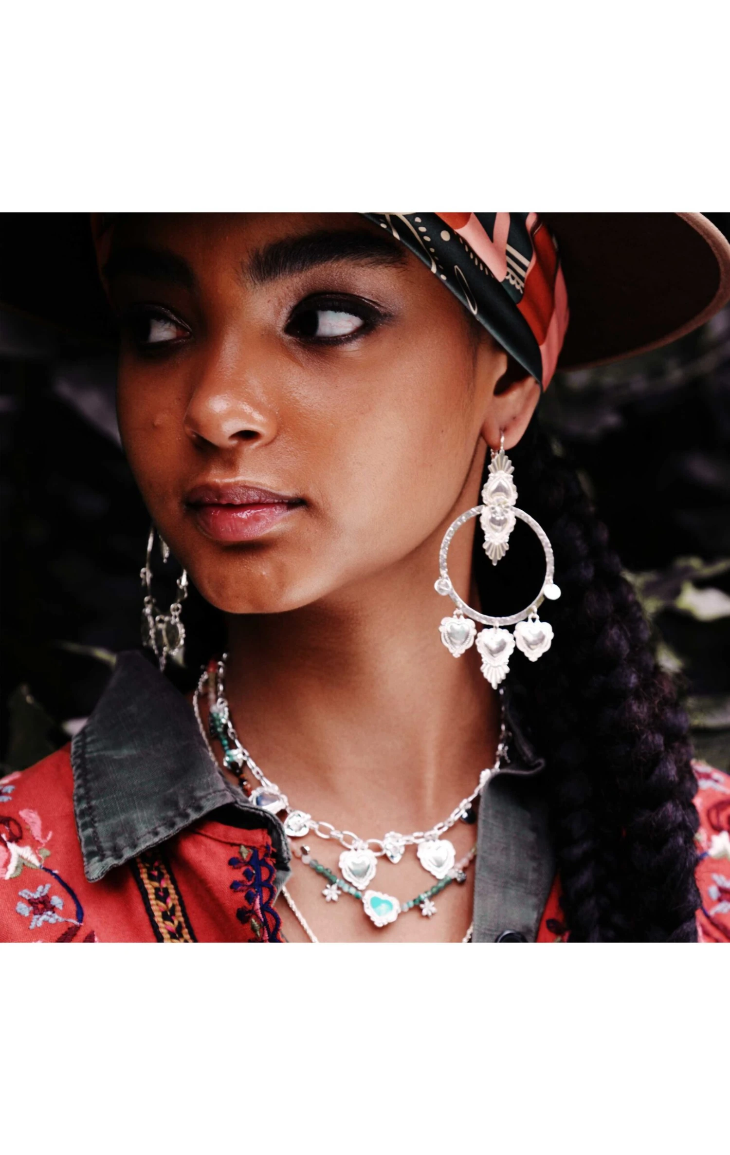 Boucles d’oreilles créoles pour oreilles percées plaquées argent, munies d’une attache dormeuse. La tête de boucle est composée de deux cœurs inversés argentés, travaillés de style baroque sur un anneau créole orné de pampilles breloques effet argent: des petits cœurs et sequins d’inspiration Amérique Latine. On craque pour ce total-look argenté très clinquant. Ce bijou est fait à la main.