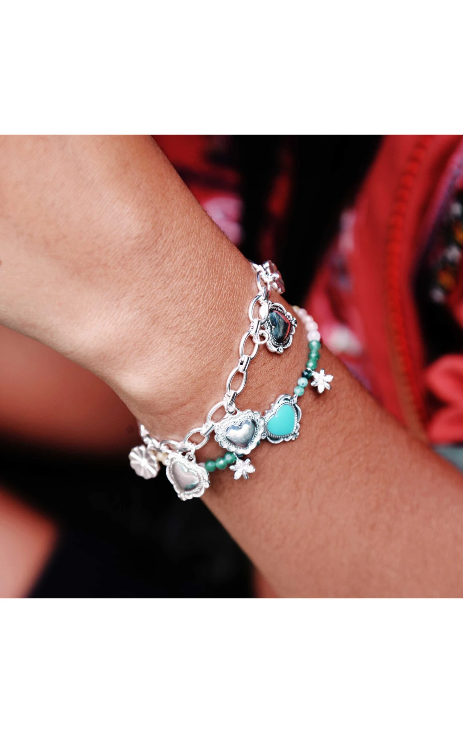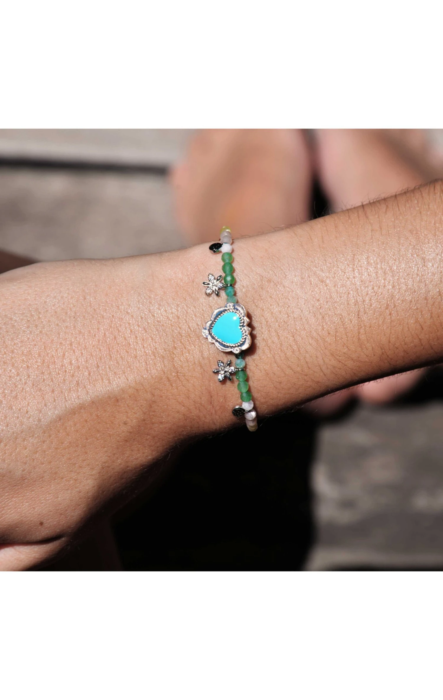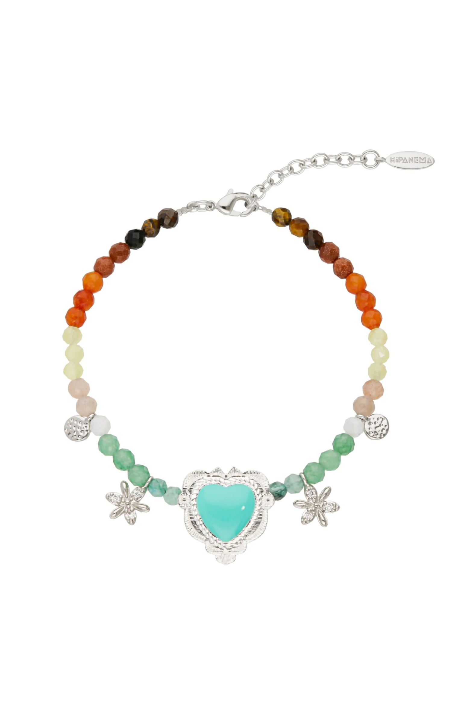 Petit bracelet en pierres semi-précieuses – tourmaline rose, quartz teinté, hématite, turquoise – sur un montage en laiton argenté, rehaussé de petites pampilles argentées. On aime le mélange Amérique Latine des pierres colorées, dans une déclinaison de tonalités Terre, ocre, avec ce cabochon central en forme de cœur ex-voto travaillé d’inspiration Nouveau-Mexique, orné d’une résine turquoise. Il est entouré de deux petites pâquerettes strassées effet diamant. Une ravissante pièce facile, pile dans l’ADN Hipanema. Ce bijou est fait à la main.