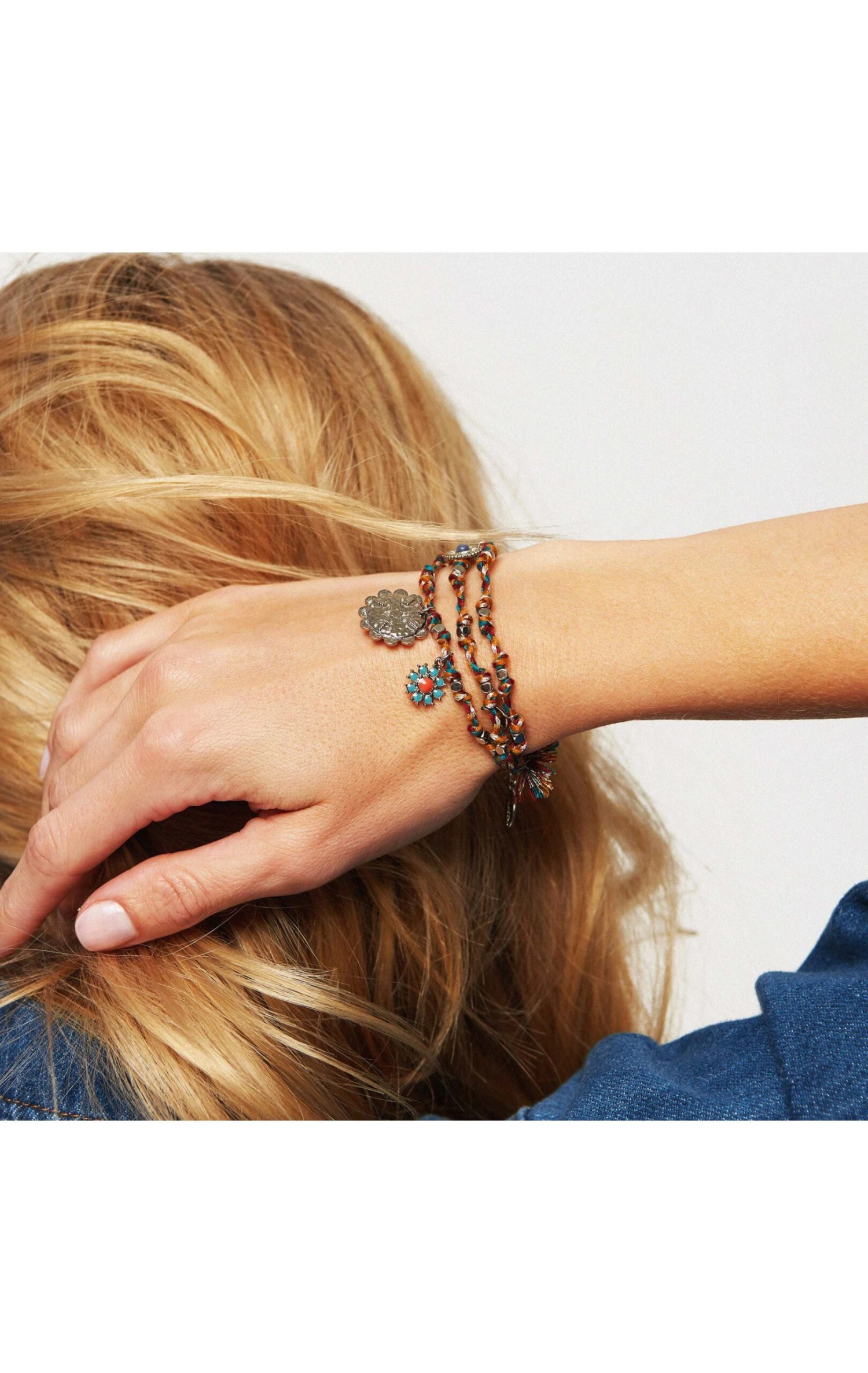 Cet hiver assumez votre côté ethnique avec ce petit bracelet composé de cordes de coton dans les tons bordeaux, caramel, turquoise et argent. Ce bracelet multiliens est une petite merveille qui regroupe des pampilles gri-gris porte-bonheur. Les pampilles sont en forme de fleurs multicolores et de petites lunes vous portègeant du mauvais sort. Vous allez adorer cet esprit Navajo, revisité de manière baroque, qui rend ce bracelet atypique et féminin.