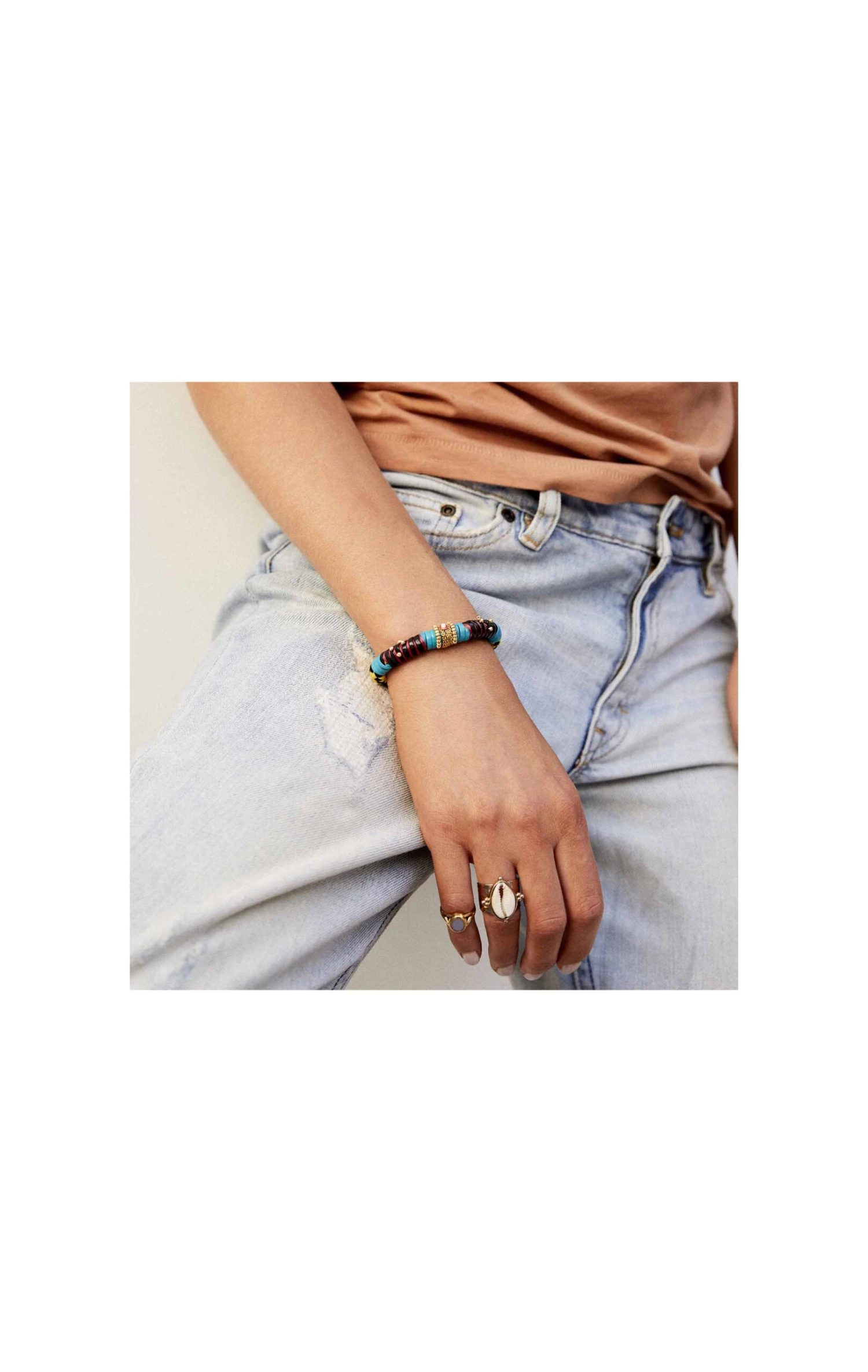 La combinaison présentée ici est faite d’un bracelet « MARNY », bracelets-cordes de taille moyenne. Monté sur une corde jaune et noir, il est décoré de liens et de scoubidou noir, bleu turquoise et bordeaux, ainsi que d’une chaîne dorée à l’or fin 14 carats au centre.