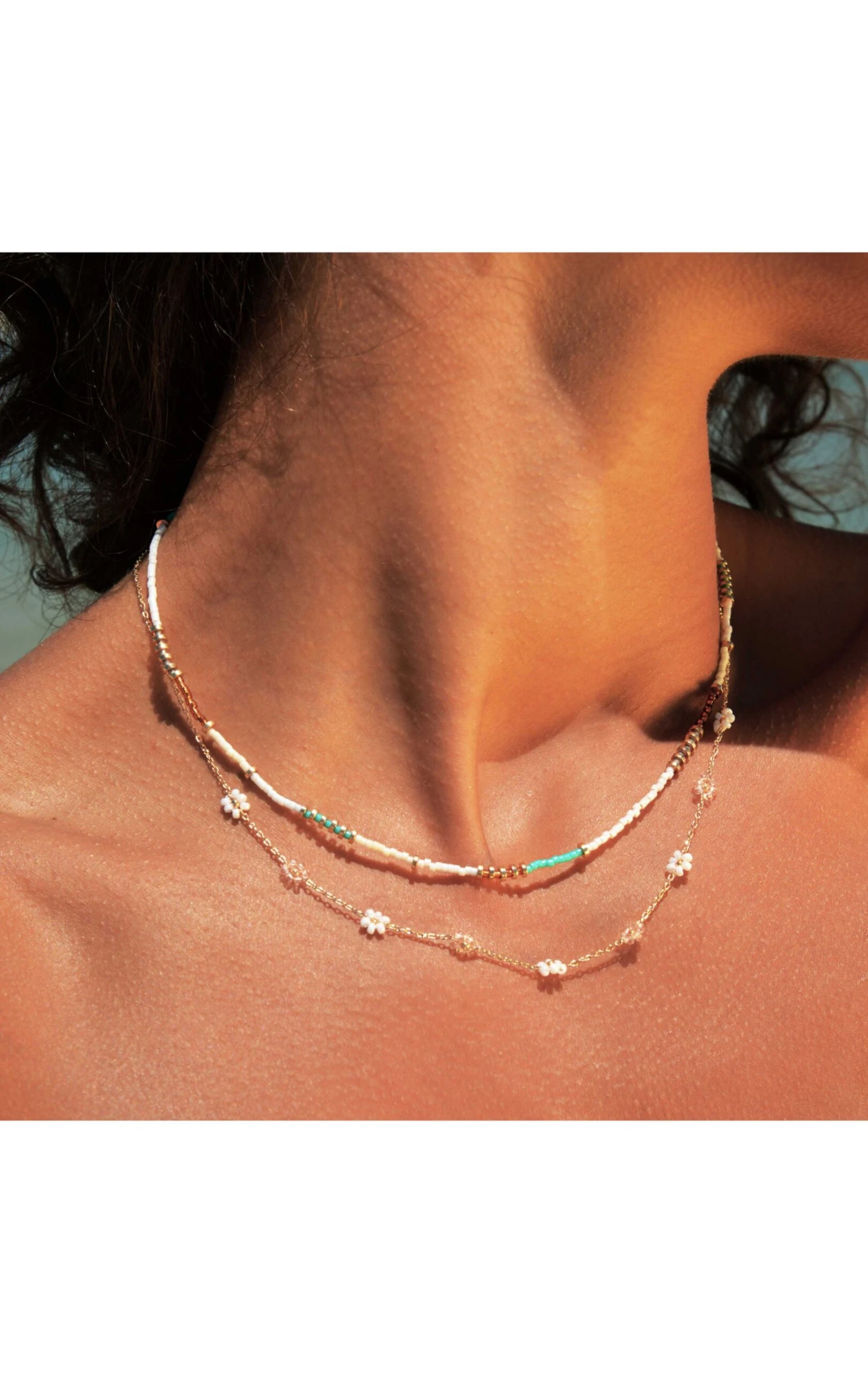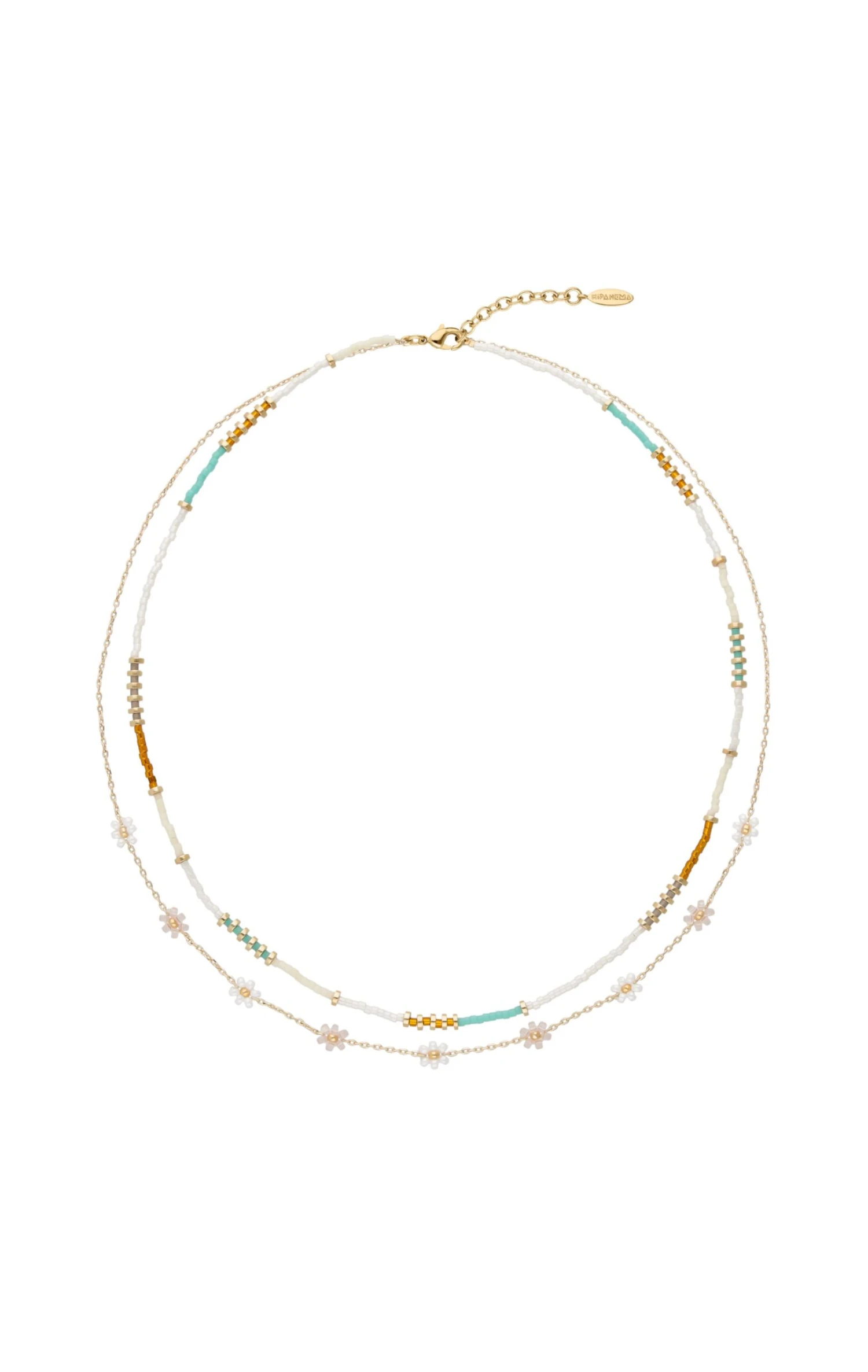 Voilà l’été avec ce collier double-chaîne ensoleillé: le premier lien est composé de perles de verre dans des tons blanc, turquoise, ocre, effet nacré perle. Le deuxième lien est une chaîne forçat dorée à l’or fin 18 carats, sur laquelle sont brodées des marguerites effet nacré. Un bijou fait à la main, parfait pour les beaux jours.