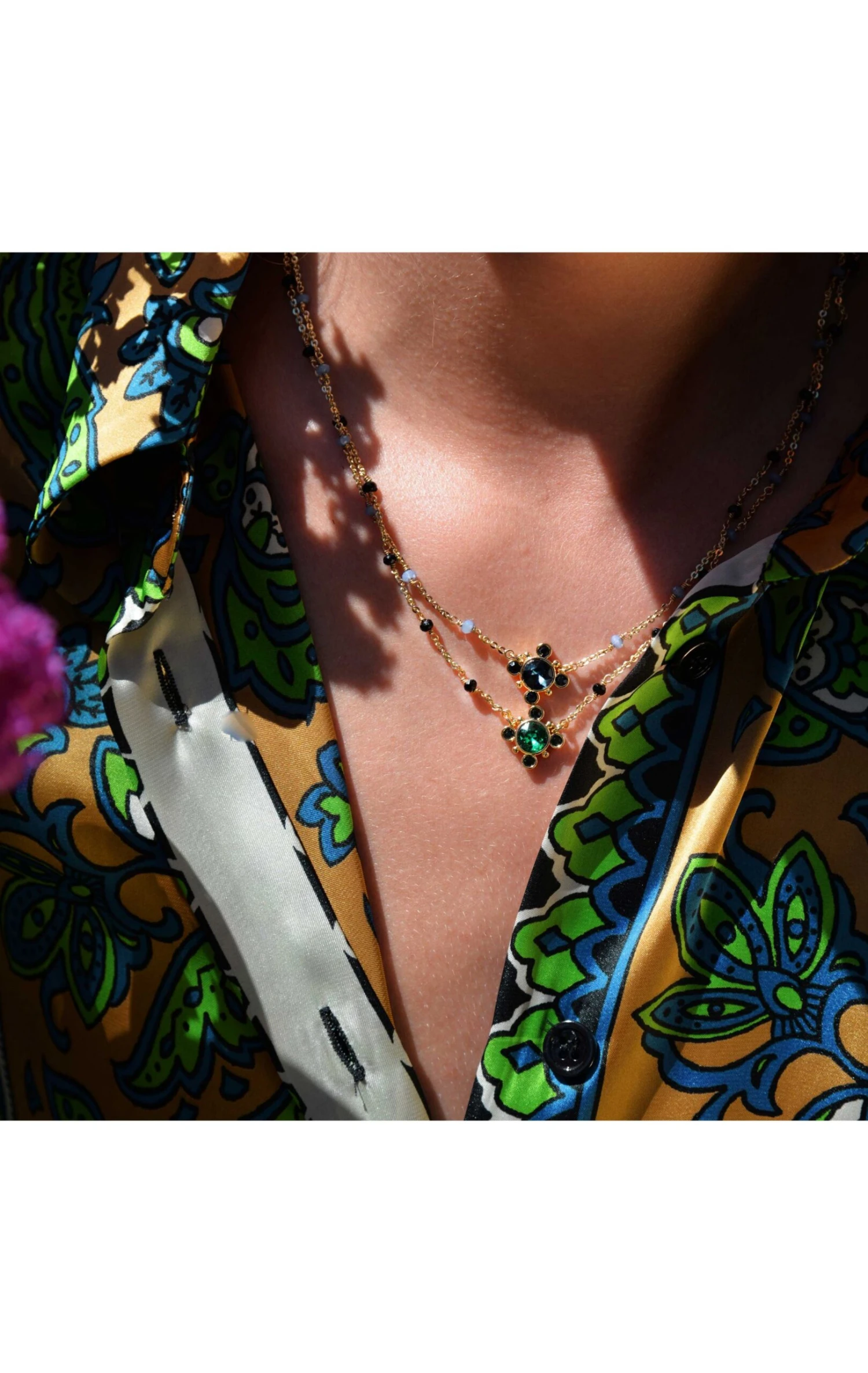 Ravissant collier monté sur une chaîne chapelet en laiton doré à l’or fin 14 carats, composée de perles de verre facettées noires. On adore l’effet petite croix revisitée de ce charm pampille au centre, composé d’un gros strass entouré de quatre petits strass assortis vert effet émeraude. C’est l’élégant petit bijou d’été, fait à la main, à adopter sans hésiter, avec la touche Hipanema, entre originalité et raffinement.