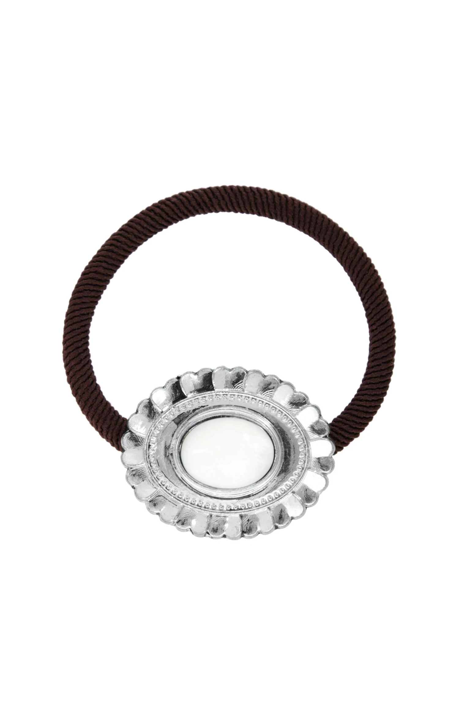 Hipanema imagine pour vous des accessoires de cheveux haut de gamme twistés du chic décalé fidèle à l’ADN de la marque. On retrouve ici un élastique de cheveux marron, avec un cabochon argenté revisitant librement les codes Navajo, travaillé en oval en forme de fleurs avec des pétales. En son centre, une pierre véritable: en agate blanche, pour parer vos cheveux de vos précieux. Ce bijou est fait à la main.