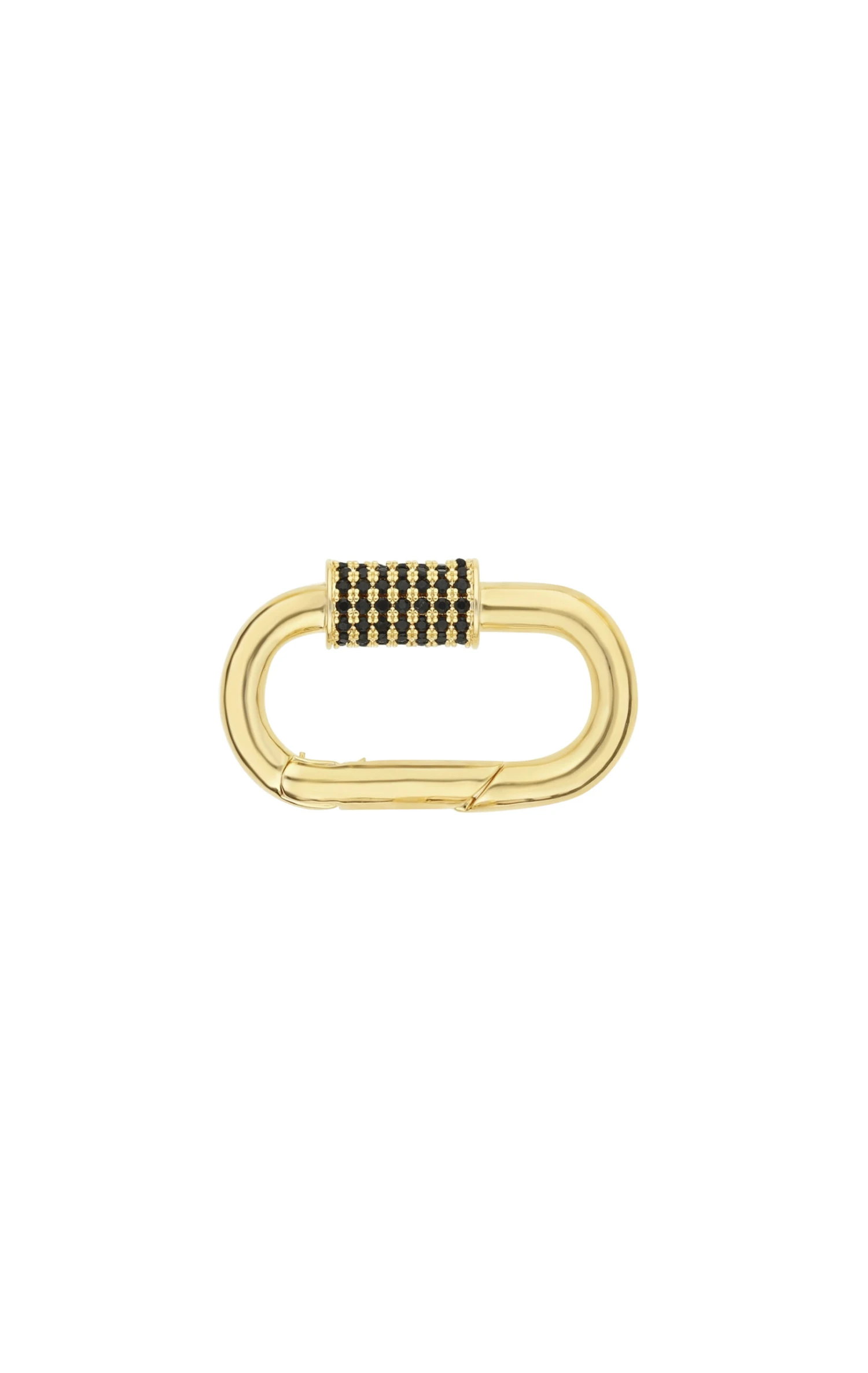 Le LOCKETS « BIG » est un grand fermoir mousqueton. Il est ici présenté en laiton plaqué à l’or fin 14 carats et le pas de vis orné de cristaux noirs effet diamant noir.