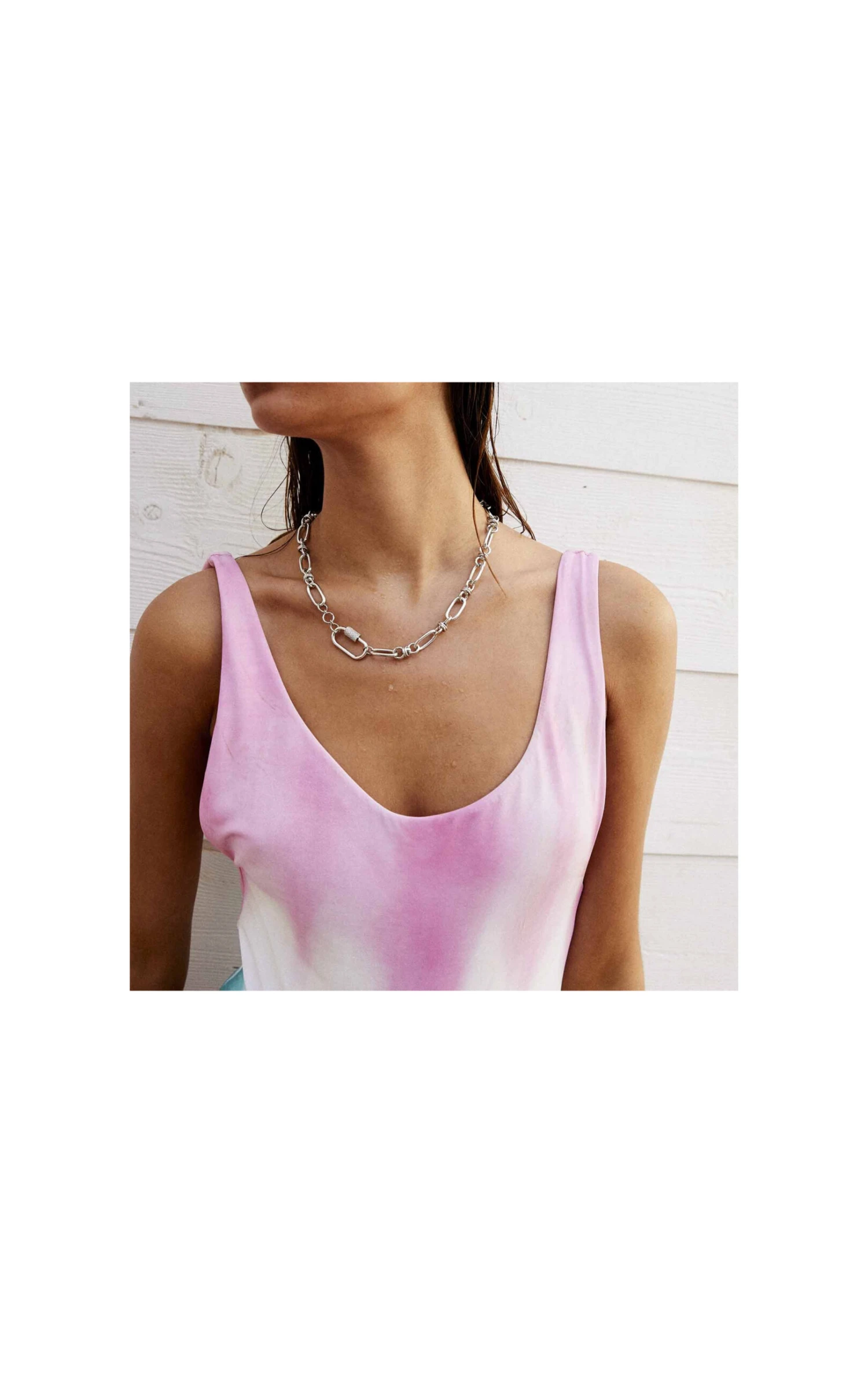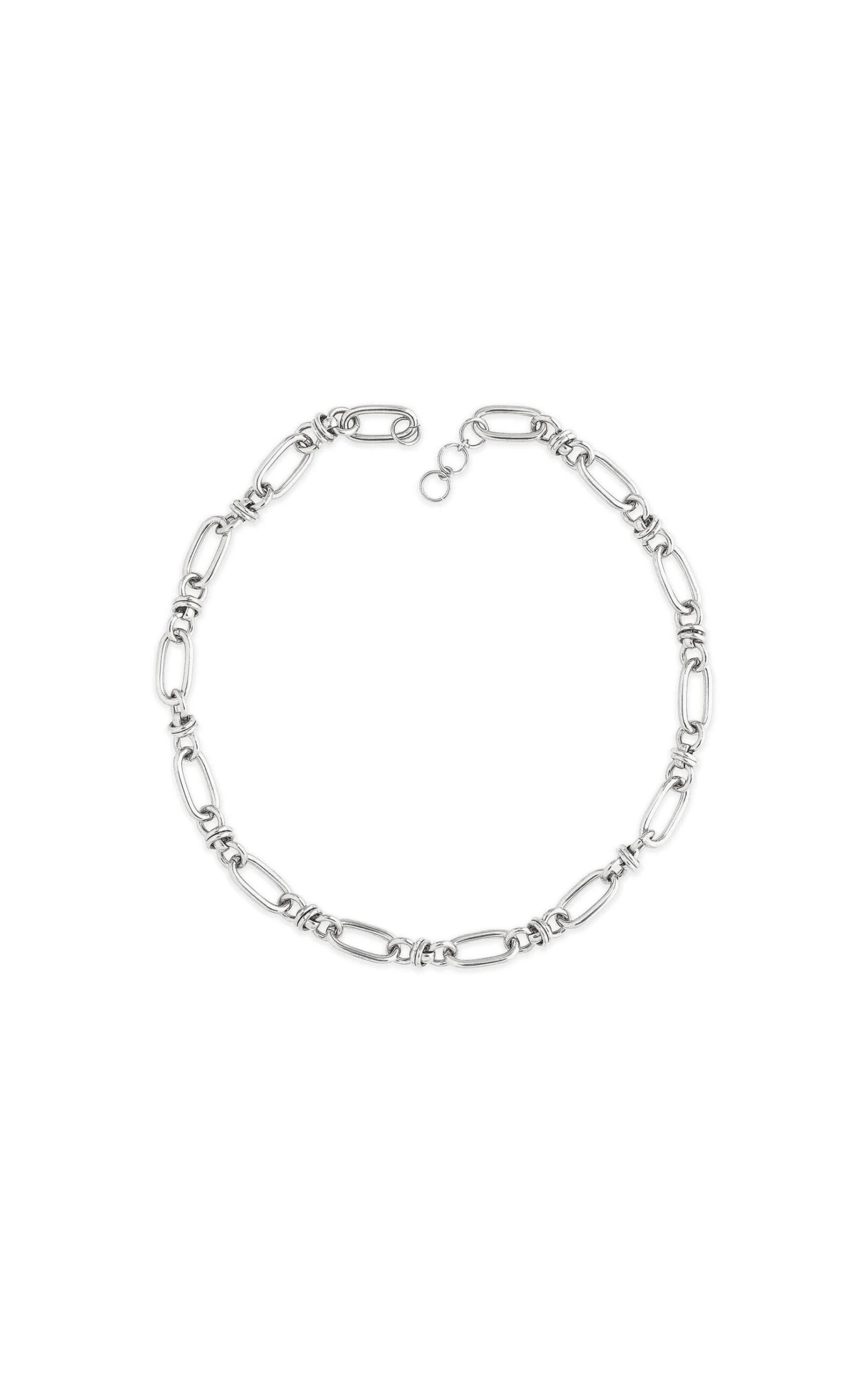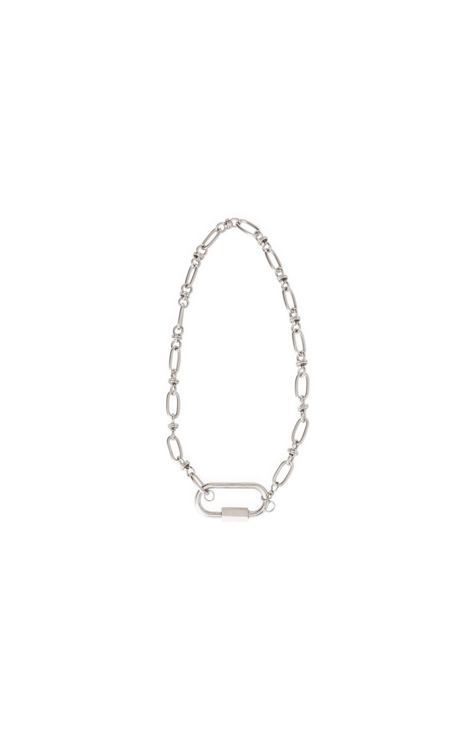 Les colliers « CARAVELLE » sont les liens en chaîne. Ici vous est présentée une chaîne épaisse de maille ovale rattachée avec un maillon papillon argentée au rhodium.