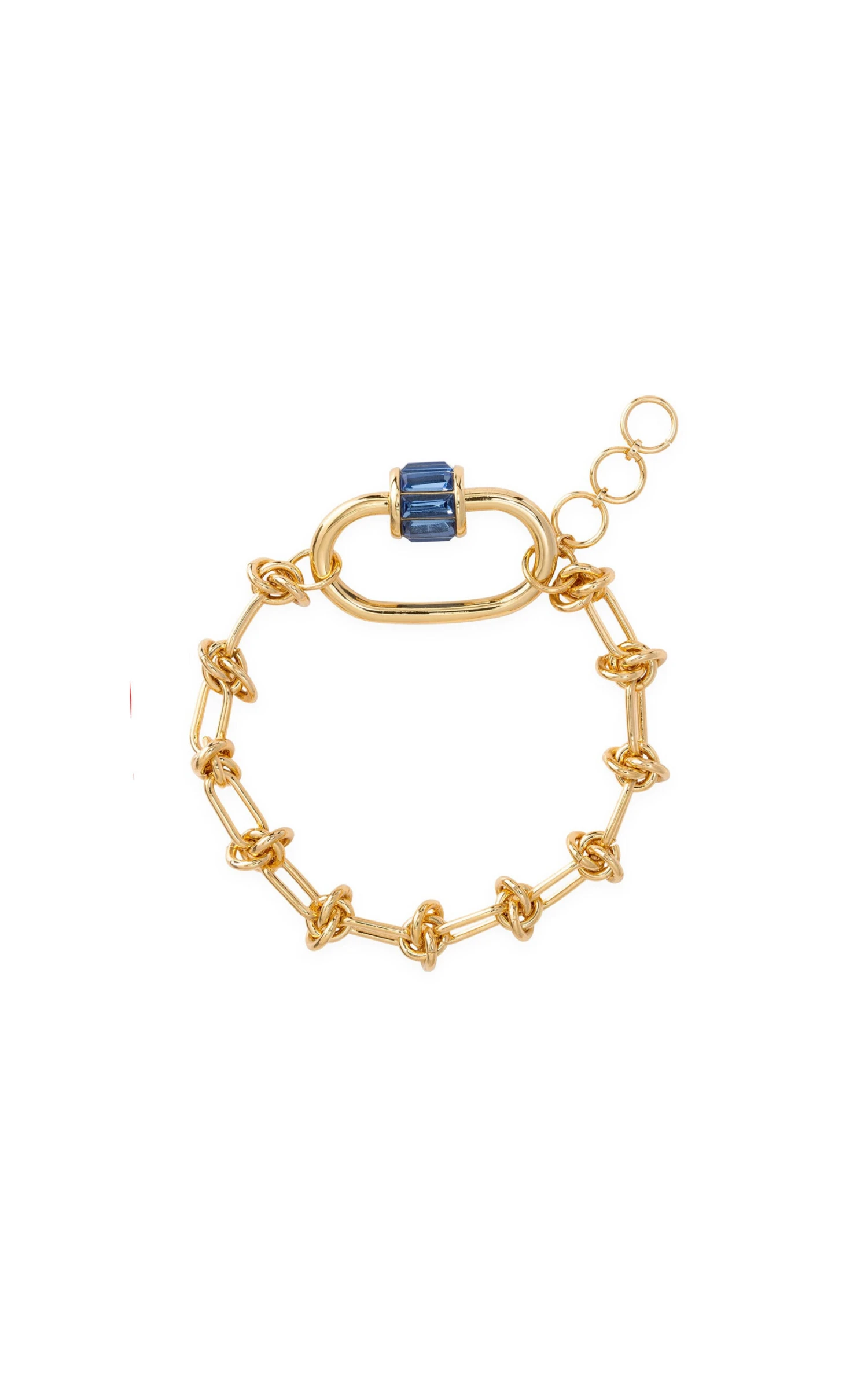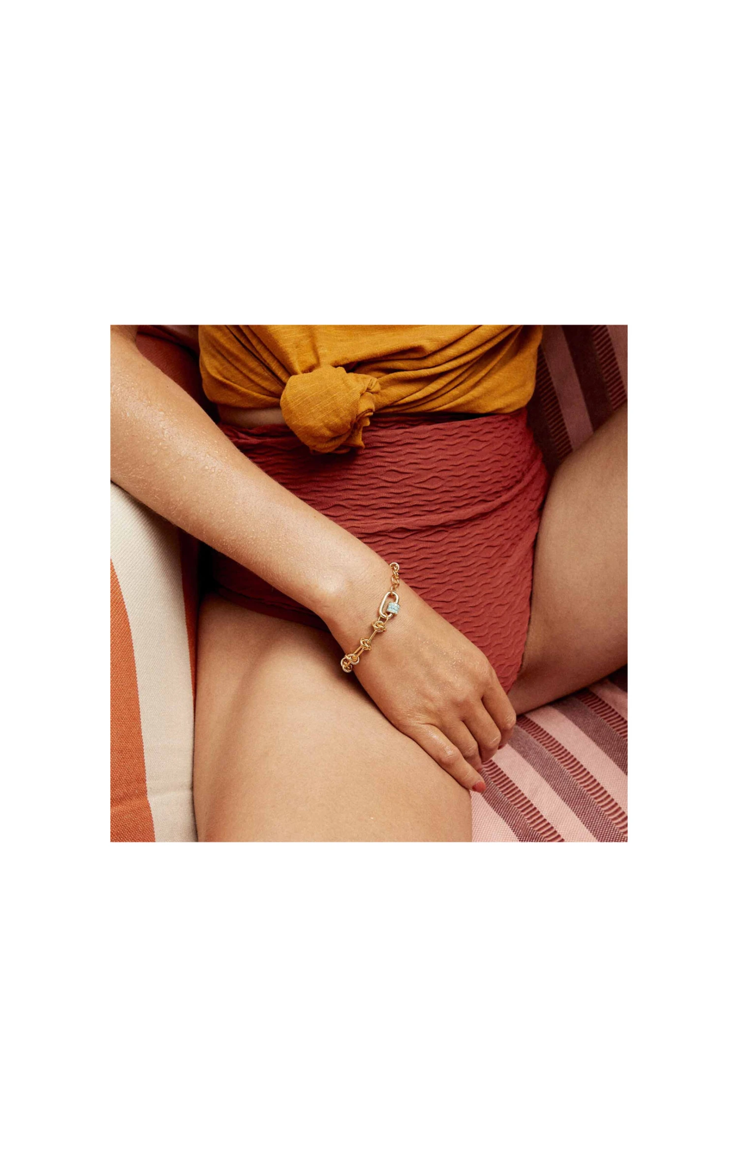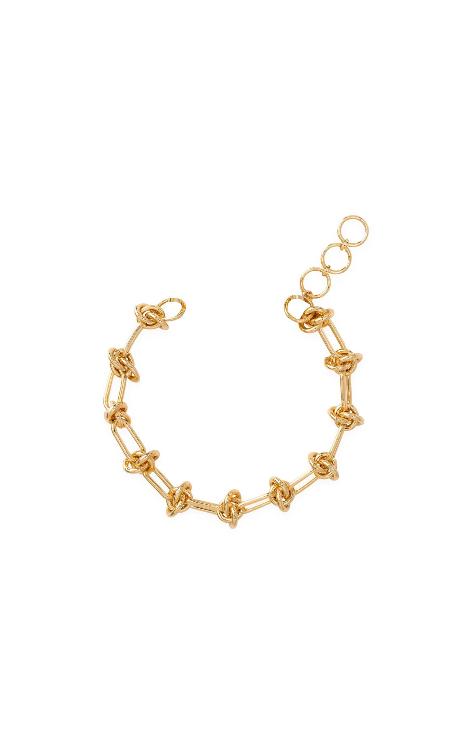 Les bracelets « CLARE » sont les liens en chaîne. Ici vous est présenté une chaîne épaisse de maille rectangle intercalée de nœuds, dorée à l’or fin 14 carats.