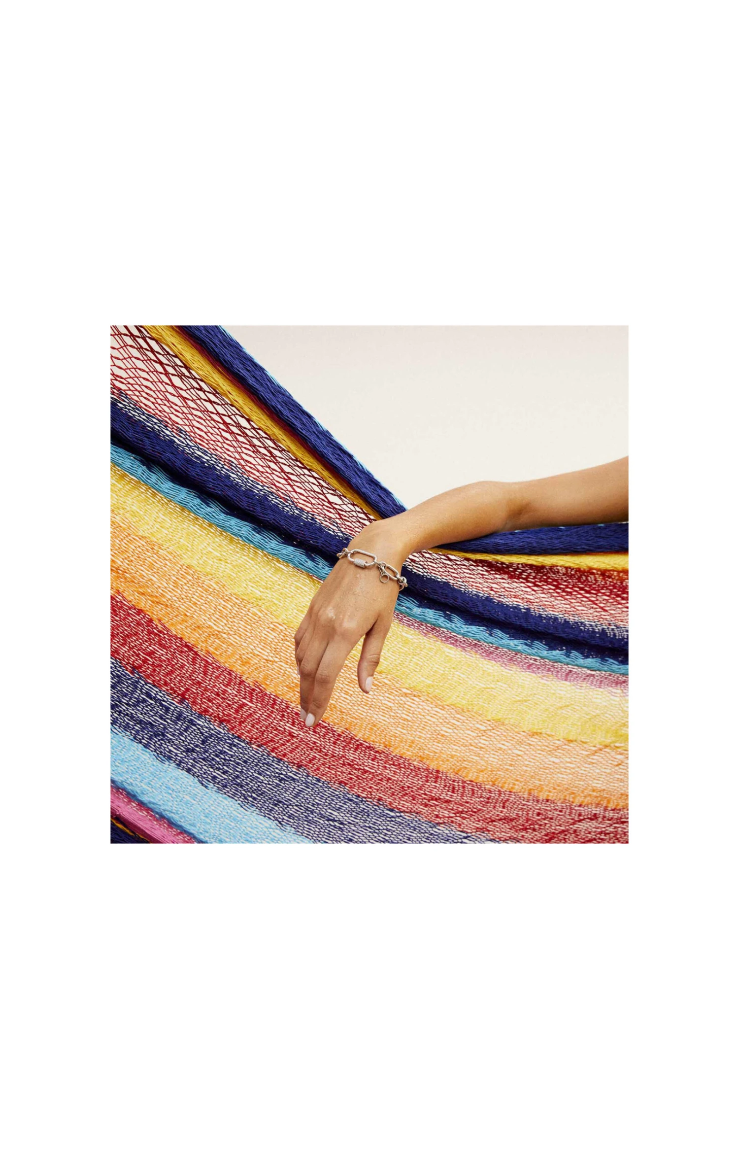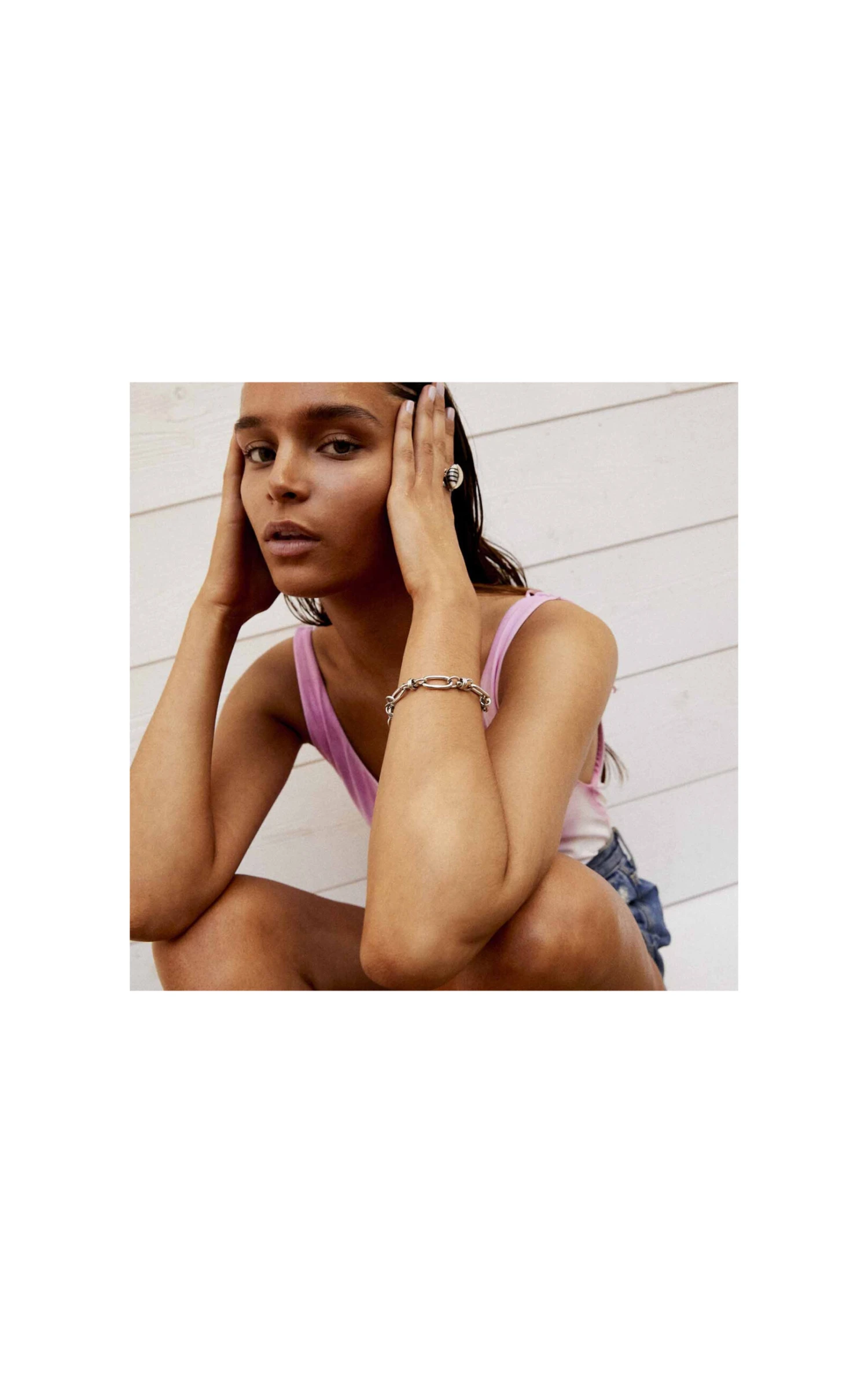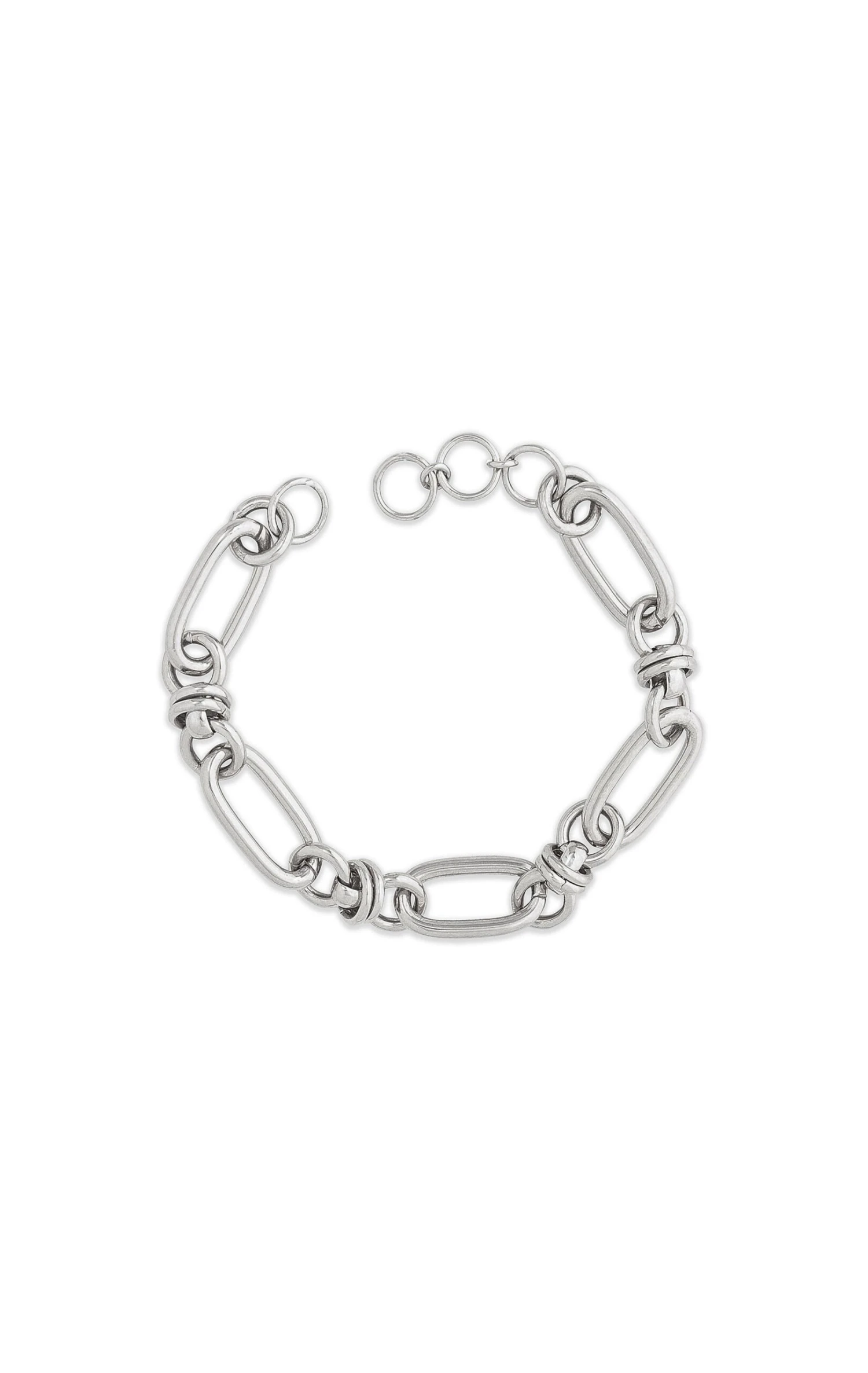 Les bracelets « CLARE » sont les liens en chaîne. Ici vous est présenté une chaîne fine de maille rectangle intercalée de trois petits anneaux, argentée au rhodium.
