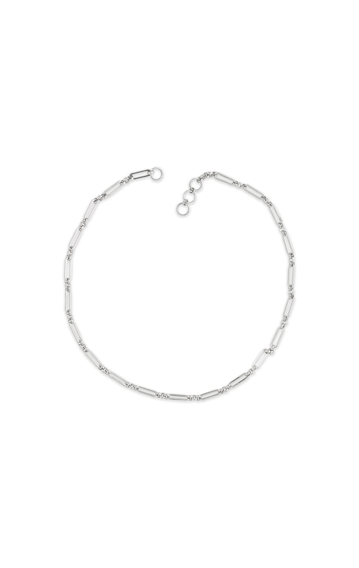 Les colliers « CRUSOE » sont les liens en chaîne ras du cou. Ici vous est présenté une chaîne fine de maille rectangle intercalée de trois petits anneaux, argentée au rhodium. Fermoir non inclus, il faudra compléter votre commande avec un Locket.