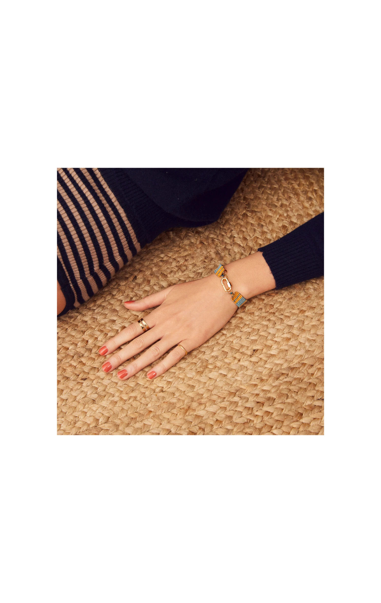 Lien entièrement tissé à la main de fil très fin de couleur turquoise fonçé, bleu canard et bronze. Décoré de trois pampilles dorées en son centre, pavées de strass effet diamant. À associer avec les fermoirs « LOCKETS ».