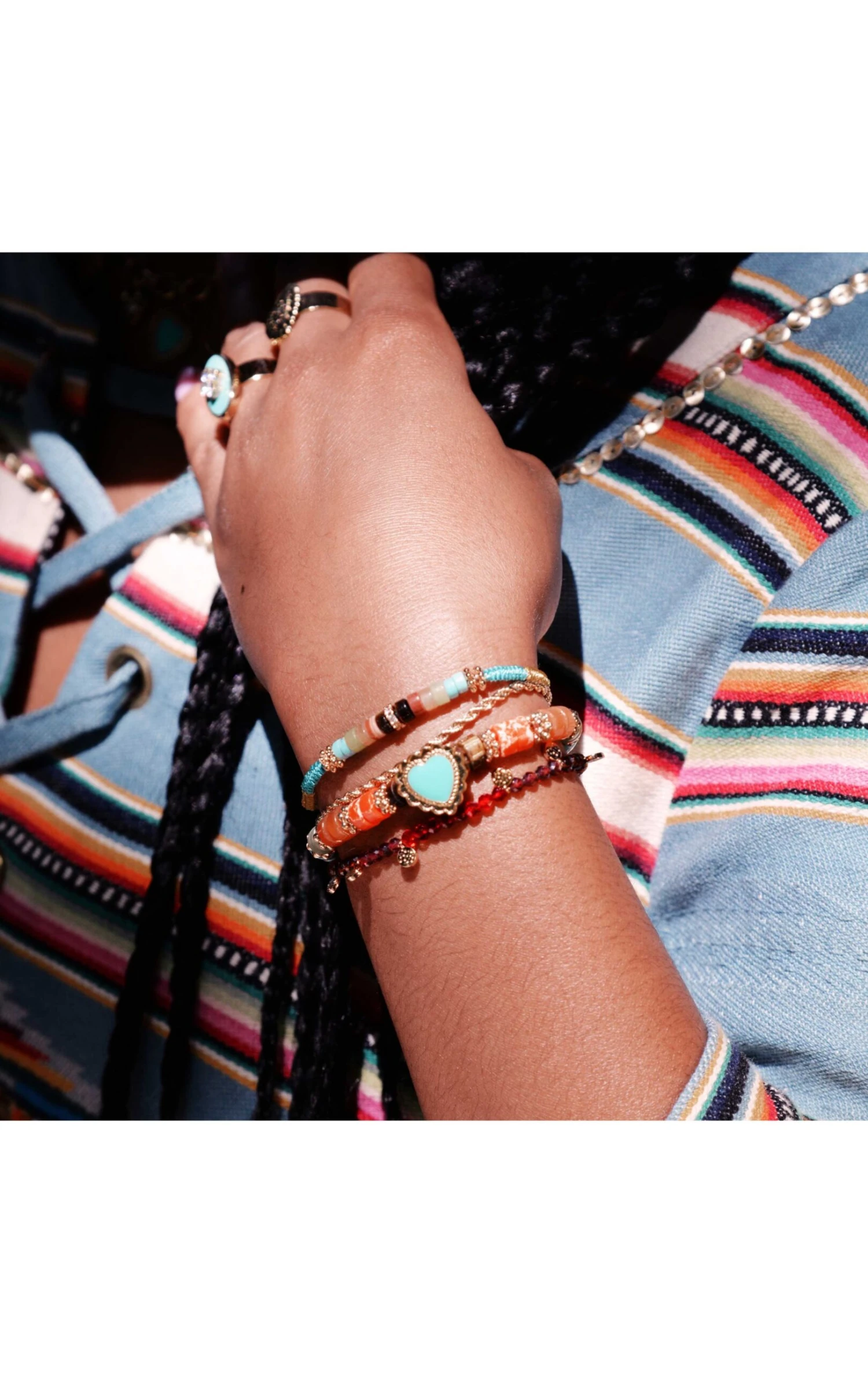 Avec Hipanema et nos manchettes vibrantes de couleurs, c’est l’été toute l’année. Des bracelets bonne-humeur entièrement faits à la main, que nous réinventons chaque saison, dans la joie et les couleurs! Ce bracelet manchette multi-liens réinterprète la thématique forte de notre collection Nouveau-Mexique avec son cabochon cœur ex-voto en son centre, orné d’émail vert turquoise. Il est sur un lien en rondelles de pierres fines – œil de tigre, jade, turquoise, quartz teinté, grenat -, avec un lien de petites perles facettées, dans un dégradé de couleurs Navajo, ce côté Terre de Sienne, ocre. On retrouve une chaîne enroulée, ainsi qu’un lien tissé avec du coton pour l’esprit porte-bonheur, orné de petites perles rondelles en son centre. Aussi ethnique chic que pratique avec son fermoir aimanté, gravé Hipanema, très facile à mettre et à enlever.
