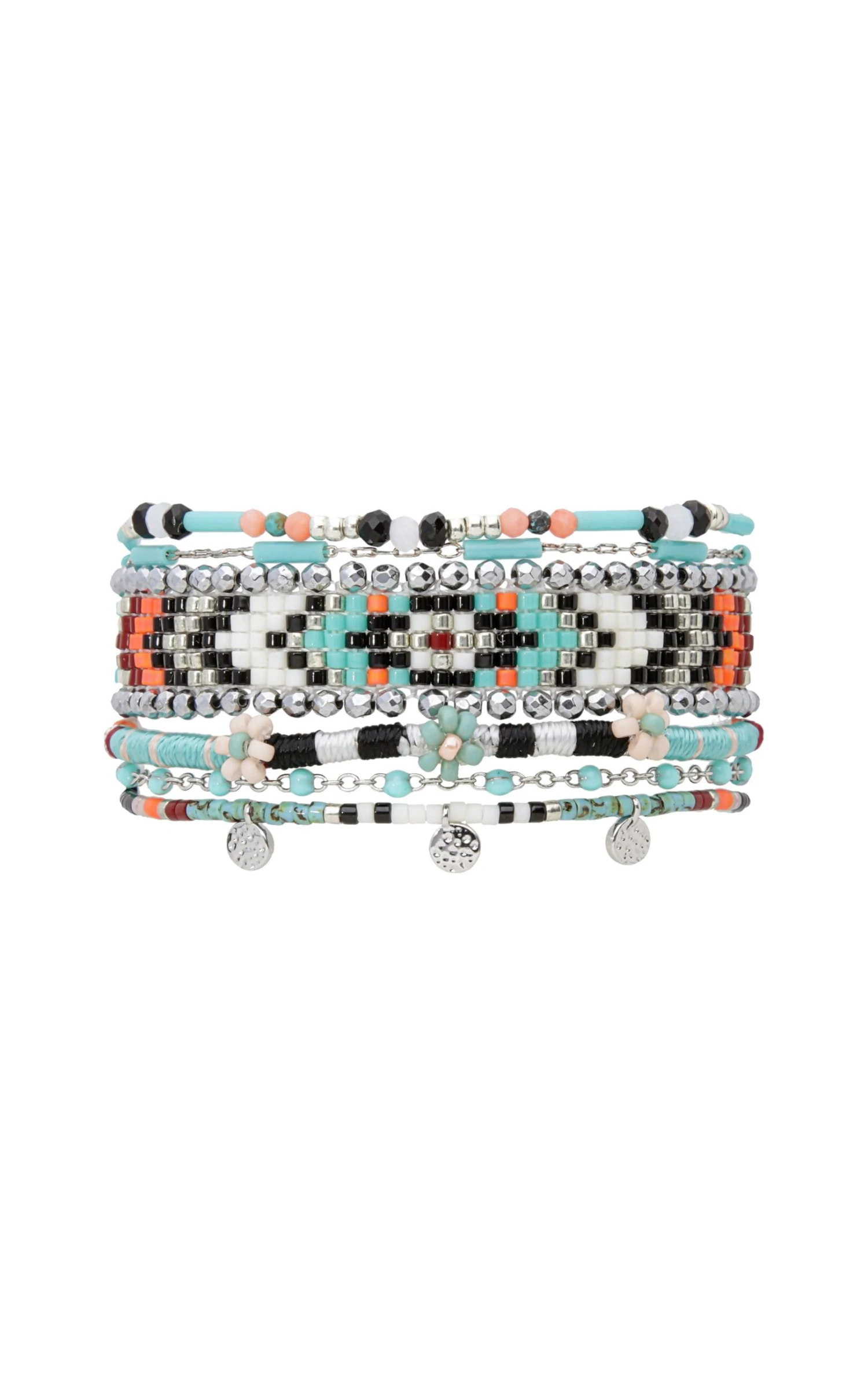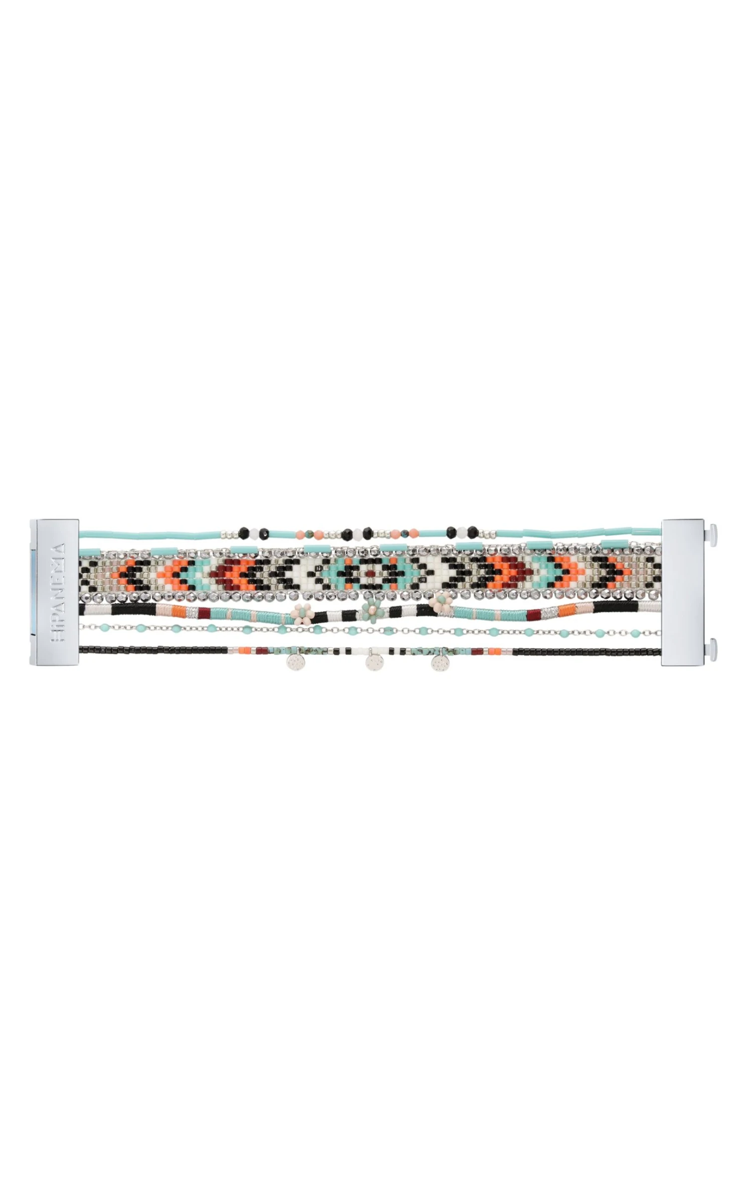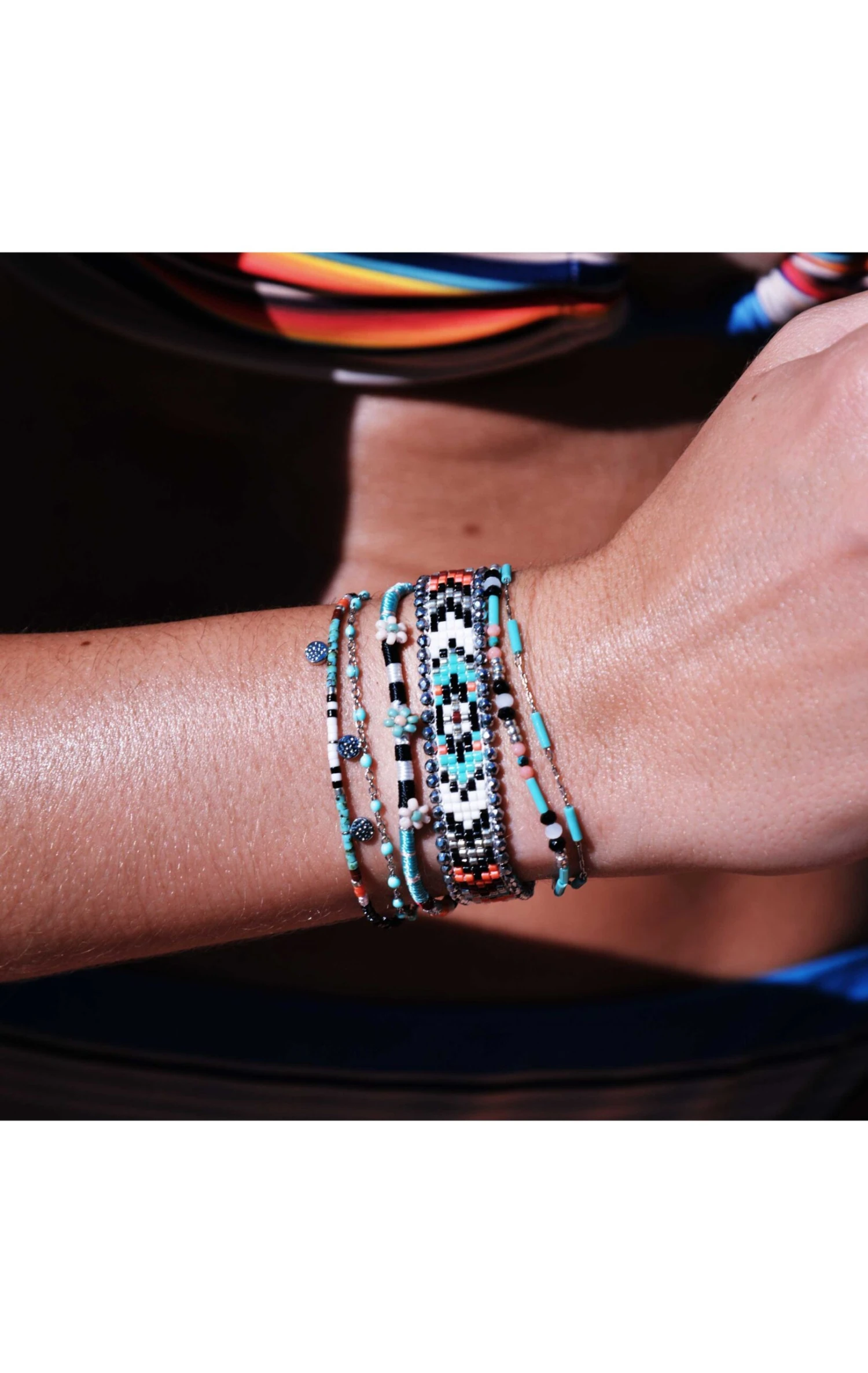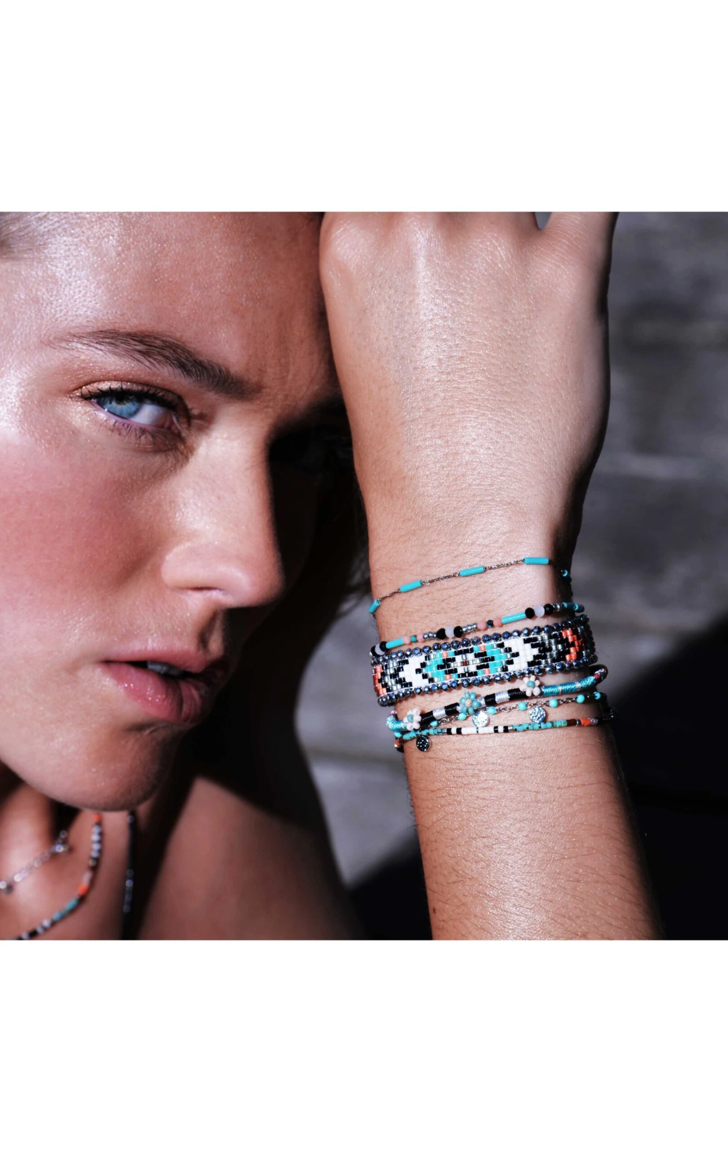 Attention, bracelet culte! Manchette turquoise qui reprend tous les codes de ce thème Navajo, avec un premier lien en perles tubes turquoise, avec un montage symétrique mais rythmé de différentes perles avec des perles facettées dans des tons rose, noir, rose corail. On retrouve une chaîne forçat ornée de perles Miyuki mais version tube turquoise. L’élément central est un tissage de perles de verre où l’on reprend un chevron très Navajo, emblématique d’Hipanema, dans les tons noir, blanc, argenté, orangé bambou de mer, blanc et turquoise. Suivi d’un lien tissé dans les mêmes tonalités, rebrodé de marguerites. Pour finir, un lien en perles de rocailles où s’intercale du noir, du turquoise, du blanc, du bambou de mer orangé, avec une élégante accumulation de sequins argentés. Ce bijou est fait à la main.
