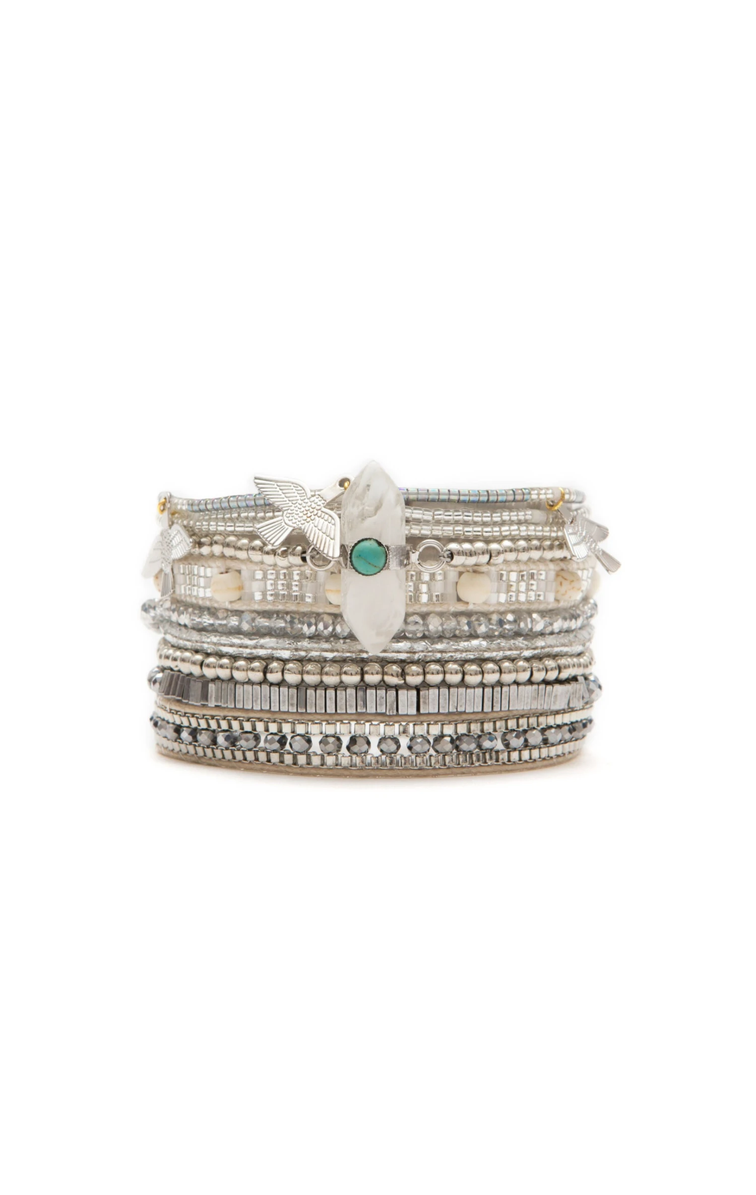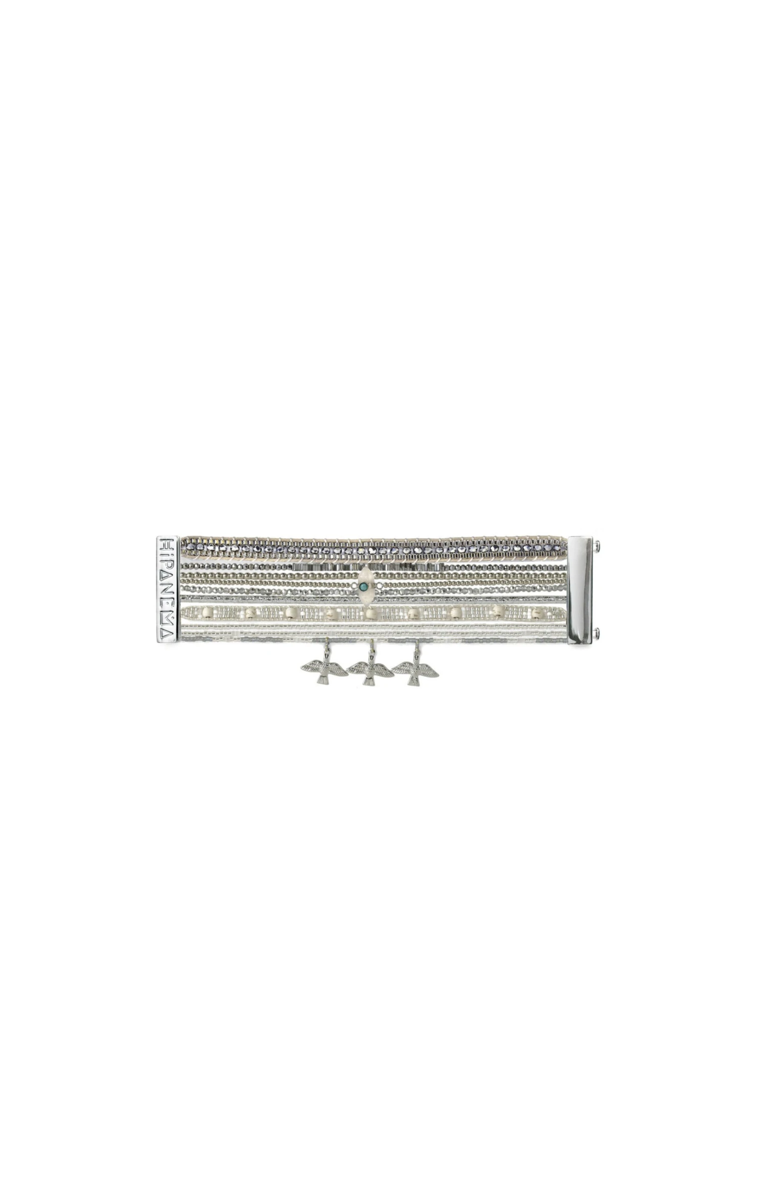 Pièce unique faite à la main, OHMYSILVER est composée d’une multitude de liens en perles argentées et surmontés de pendentifs en forme d’aigle. Chaque lien est relié par un fermoir argenté aimenté sur lequel est gravé Hipanema.