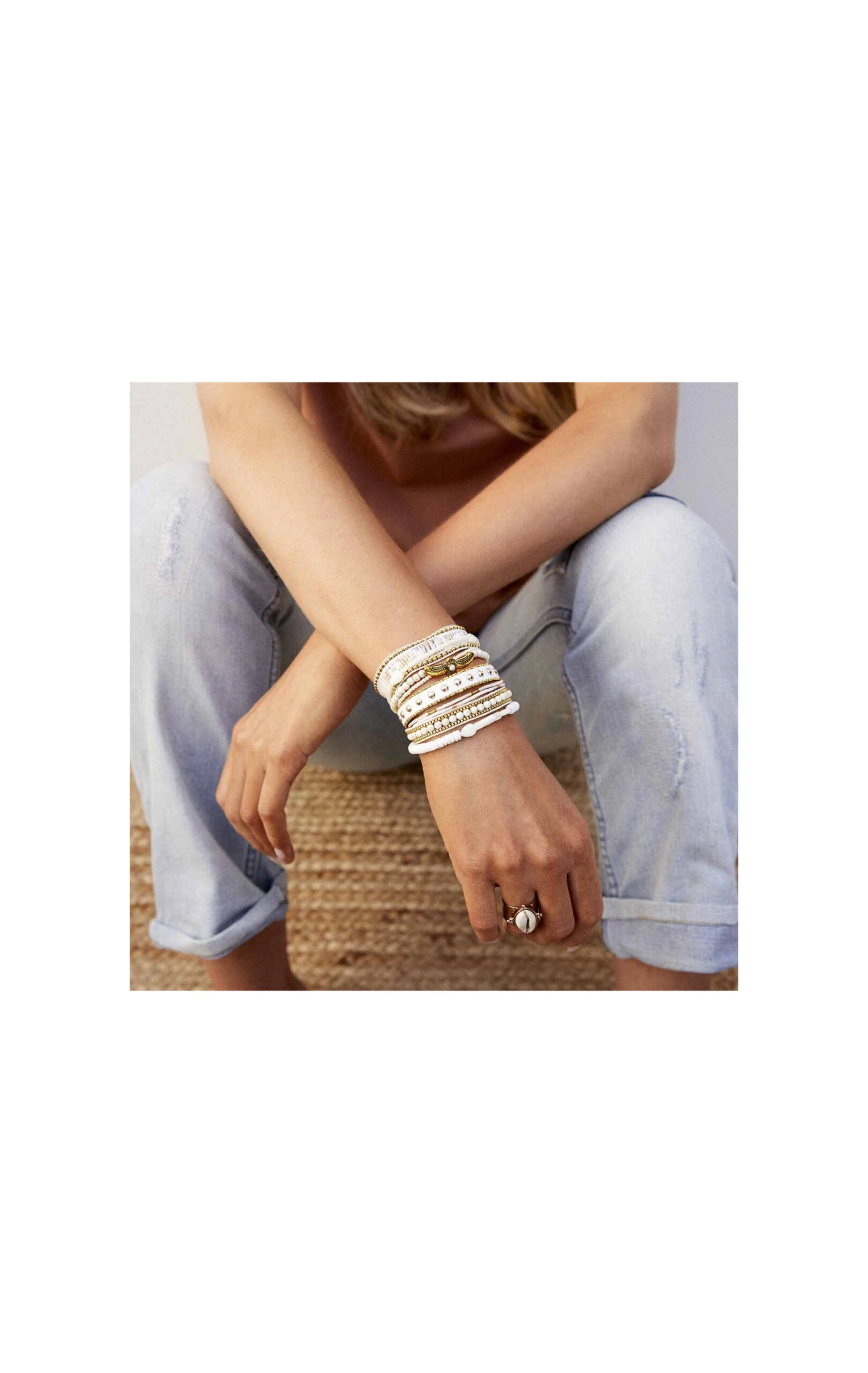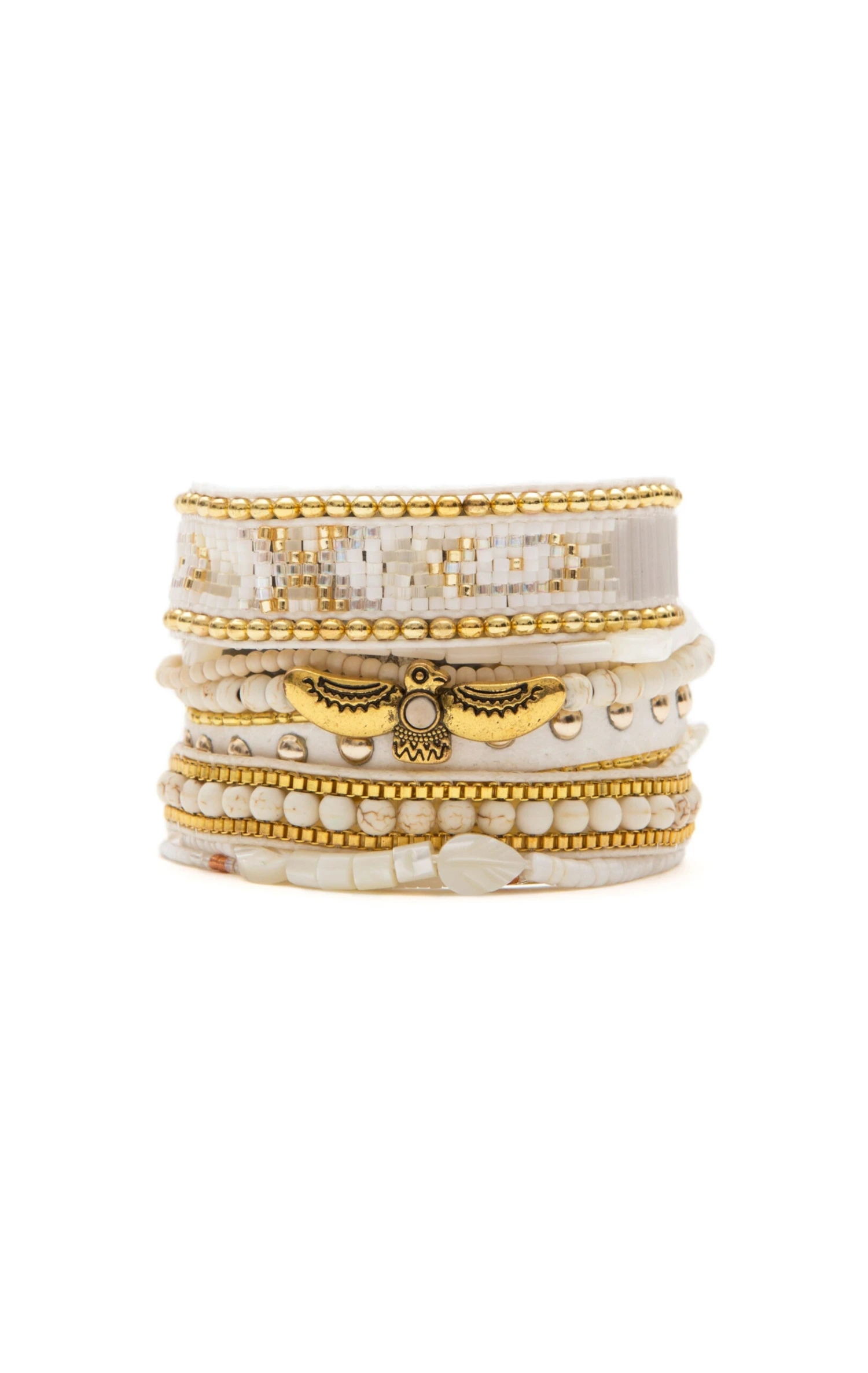 Pièce unique faite à la main, OLYMPE est composée d’une multitude de liens en perles blanches et dorées et d’un charm central en forme d’aigle. Chaque lien est relié par un fermoir doré aimanté sur lequel est gravé Hipanema.