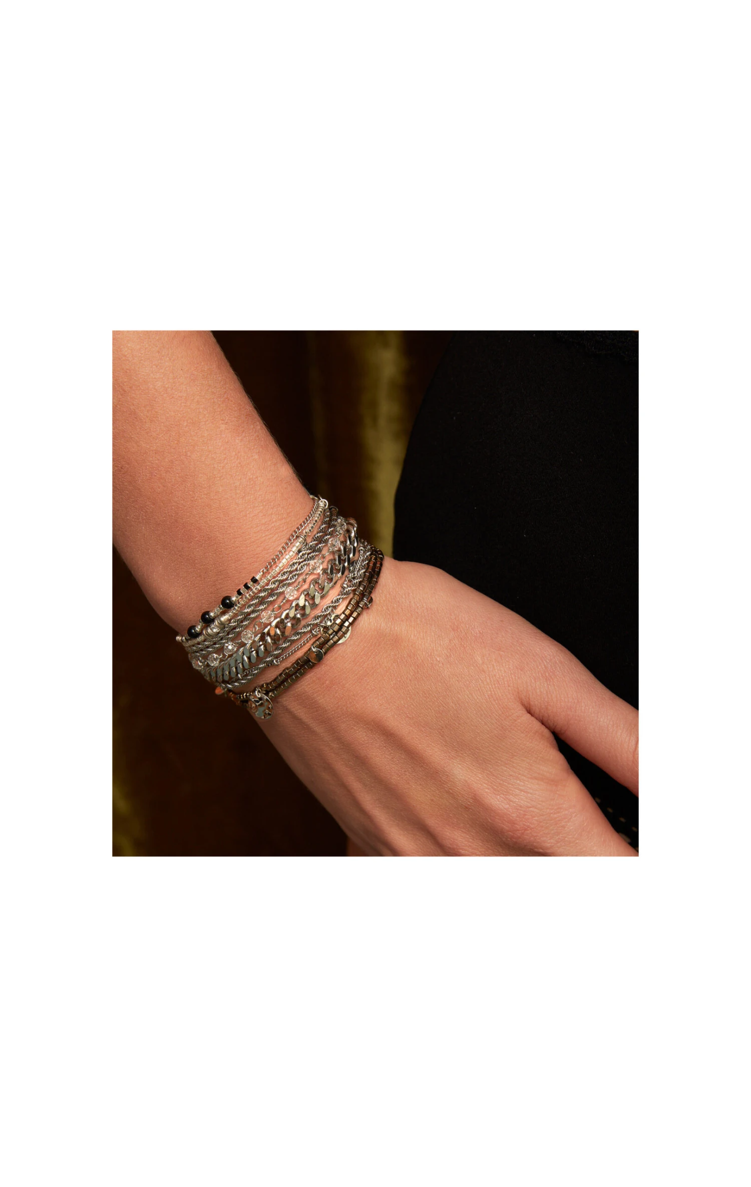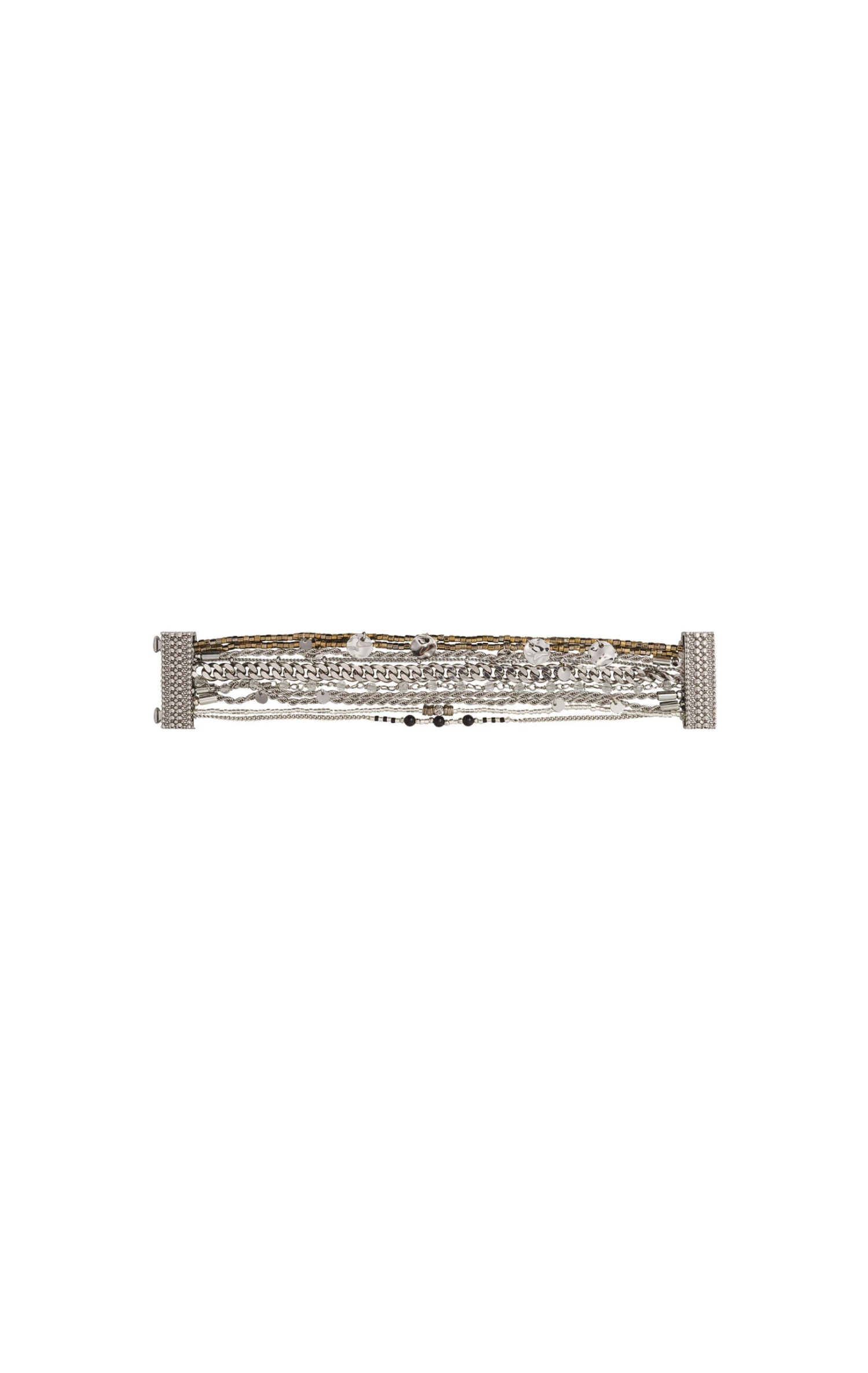 Ce bracelet manchette est composé d’une multitude de chaînes. Sa composition atypique de par ses éléments de tailles différentes, fait de cette pièce un bijou qui vous emmène en voyage entre soleil d’Orient et nuits parisiennes.